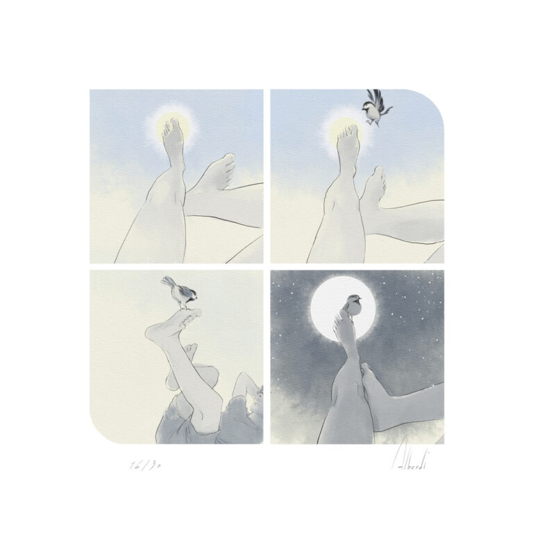 Els dibuixos il·lustren el poema “Soleiada”, de Joan Maragall, escrit el 1904 i absolutament indiferent al pas del temps. Quan el vaig escoltar amb la veu de Roger Mas, em va cautivar tant que em vaig submergir en aquest projecte durant gairebé un any. El poema i els dibuixos ens parlen de l’empoderament d’una dona embarassada pel sol, del naixement del fill lluminós, del goig de la maternitat.
